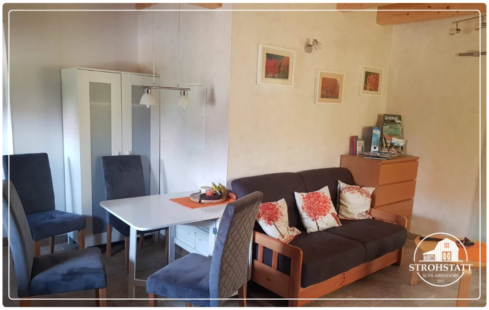 Neben einem 3-zügigen Kleiderschrank und einem Esstisch für 4 Personen findet man auch eine Schlafdoppelcouch mit Tisch, TV mit SAT-Schüssel, Garderobe sowie ausreichend Platz im Schubladenschrank.