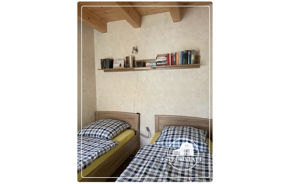 Im Schlafzimmer befinden sich 2 Einzelbetten mit 90×200 cm Liegefläche, welche auch zusammengeschoben als Doppelbett genutzt werden können. Zusätzlich ein Radiowecker, eine Leselampe und ein weiterer Beistellschrank für persönliche Gegenstände.