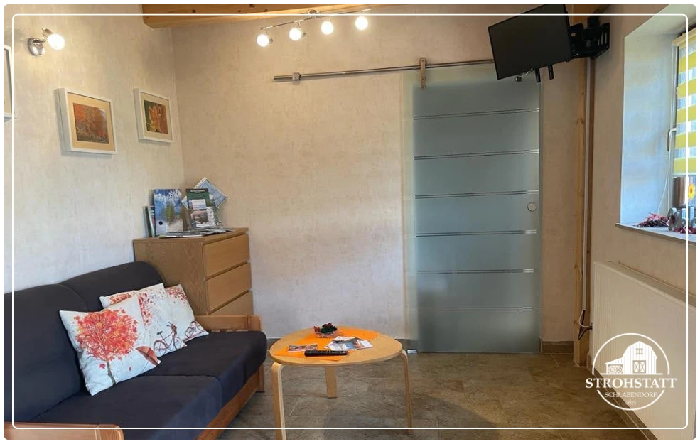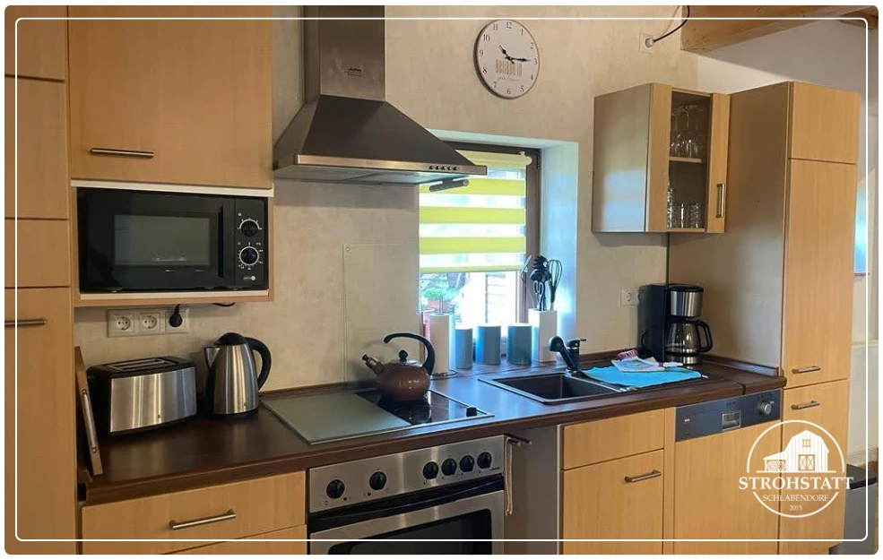 Die barrierefreie FeWo ist im rückwärtigen Teil des Wohnhauses der Eigentümergesellschaft gelegen und ist über eine Rampe auch bequem mit dem Rollstuhl oder Gehhilfen zu erreichen. Sie umfasst auf einer Fläche von ca. 35qm einen Wohn-/Essbereich mit vollausgestatteter Küche inkl. Kühlschrank, Herd, 4 Kochfelder, Backofen, Spülmaschine, Kaffemaschine, Wasserkocher, Toaster, Essgeschirr bis zu 6 Personen, Eierkocher inkl -becher, ausreichend Besteck und Kaffee- bzw. Frühstücksgeschirr. Kostenloses WLAN wird angeboten.